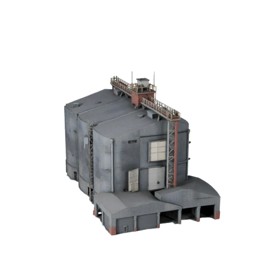 Готовая к использованию в Unity 3D модель зернового силосу для разработки игр, с низкополигональной геометрией, текстурами PBR для металла, бетона, гофрированных панелей и детализацией промышленных зданий.