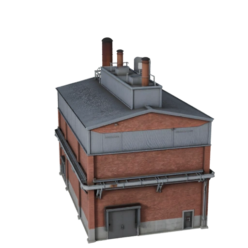 Cement Plant is a high-poly architecture 3D model for Architecture Visualization, Game Development, VR, AR, XR. The design presents sawtooth or vented roof zones, steel frame bays, large service doors, pipe runs, exhaust stacks, loading edge, and heavy industrial wall rhythm. Materials are handled through brick or metal cladding, concrete base, steel structure, roof vents, dark service doors, and aged utility surfaces, with exterior zones that make walls, windows, roof edges, trim, ground contact, and entry areas easy to read. Keep large-span industrial proportions with visible service and production zones. The render-focused variant supports archviz, look development, close exterior views, and product-style presentation where facade depth and material separation matter. The asset is suited to architectural previews, environment dressing, city layouts, real estate scenes, education visuals, concept planning, and model libraries that need a specific building type rather than a generic block. It gives artists a clear view of massing, material intent, exterior scale, and likely project fit before they place the model in a scene.