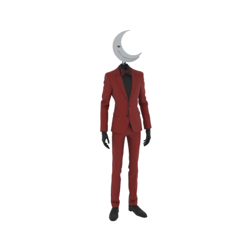 A tall, thin humanoid figure standing calmly in a dark void, full body visible. He wears an elegant red classic sui...