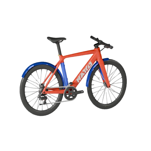 Modelo 3D de bicicleta esportiva de desenho animado para desenvolvimento de jogos com geometria baixo poli e superfícies pintadas estilizadas com blocos de cores ousados, realces simplificados e formas de veículo legíveis.