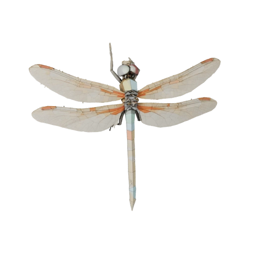 Asset de Libélula Baixo Poli focado em separação do tórax, baixo poli, exoesqueleto estilizado e preparação de rigging em tempo real para Unity.