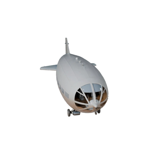 Готовая для Unreal Engine 3D модель дирижабля для разработки игр с низкополигональной геометрией и окрашенным PBR фюзеляжем из металла или композита, стеклом кабины, резиновым шасси и детализацией панелей.