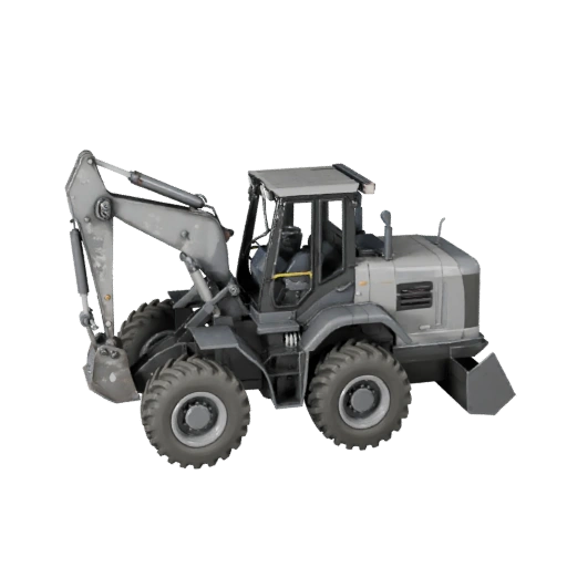 3D модель фронтального погрузчика, готовая для Unreal Engine, для разработки игр с низкополигональной геометрией и окрашенным металлом pbr, гидравлическими компонентами, резиной, стеклом и индустриальным износом.