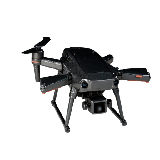 3D модель квадрокоптера дрона, готовая для Blender, для кино / анимации / VFX со средней полигональной геометрией и окрашенным фюзеляжем из металла или композита PBR, стеклом кабины, резиновым шасси и детализацией панелей.