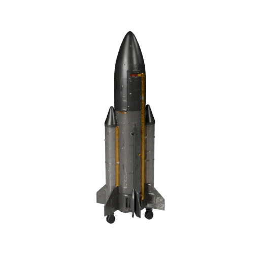 3D модель ракеты-носителя, готовая к использованию в Unity, для разработки игр с низкополигональной геометрией и PBR металлическими панелями, элементами теплозащитного экрана, светящимися акцентами и модульным аэрокосмическим разделением материалов.