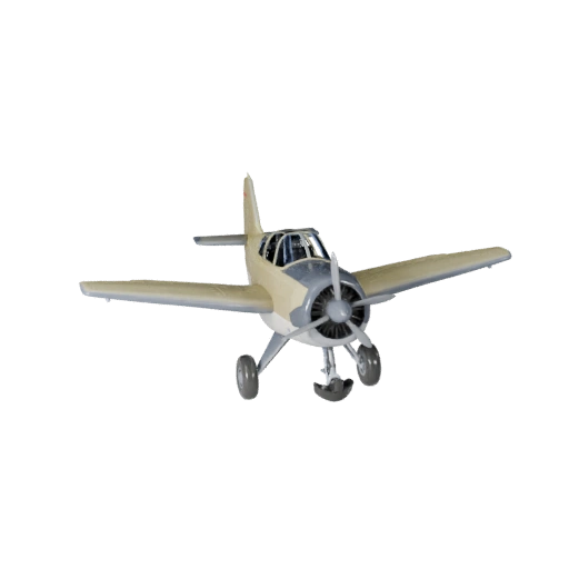 3D модель самолета с пропеллером, готовая для Unity, для разработки игр с низкополигональной геометрией и PBR окрашенным металлическим или композитным фюзеляжем, стеклом кабины, резиновым шасси и детализацией стыков панелей.