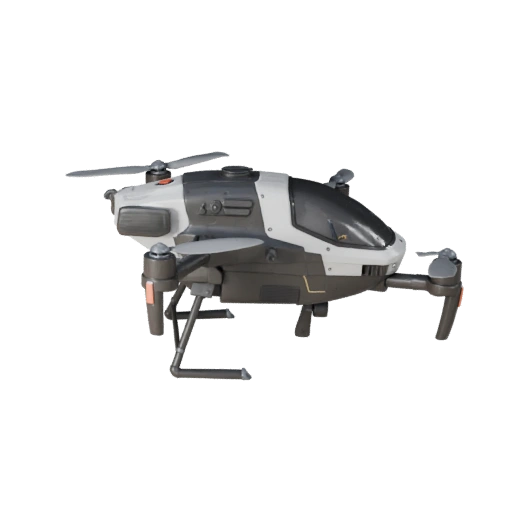 Готовый к игре 3D модель квадрокоптера дрона для разработки игр со средней полигональностью и окрашенным фюзеляжем из металла или композита с PBR, стеклом кабины, резиновым шасси и детализацией панелей.