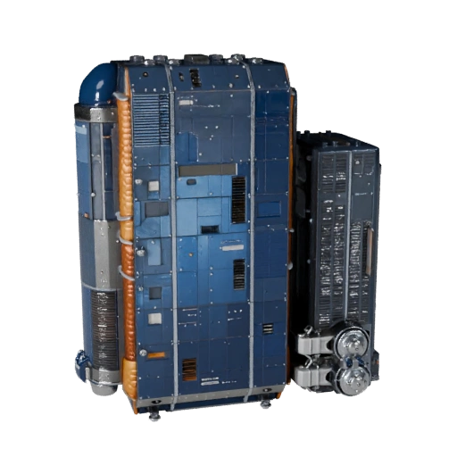 Реалистичная 3D модель грузового космического корабля для кино / анимации / VFX со средней полигональностью и PBR металлическими панелями, элементами термоодеяла, светящимися акцентами и модульным аэрокосмическим разделением материалов.