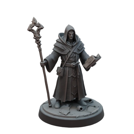 Миниатюра волшебника в стиле темного фэнтези STL разработана для DnD и настольных игр. Этот концепт для печати использует читаемый силуэт, детализированную скульптуру и композицию, готовую к встрече, для печати смолой и коллекционной покраски