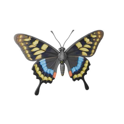 Мультяшный ассет бабочки махаон с акцентом на размещение усиков, низкополигональный, стилизованный экзоскелет и подготовка к риггингу в реальном времени для Unity.