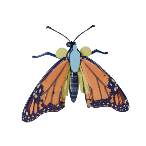 Мультяшный ассет бабочки монарх с акцентом на разделение грудной клетки, низкополигональный, стилизованный экзоскелет и подготовка к риггингу в реальном времени для Unity.