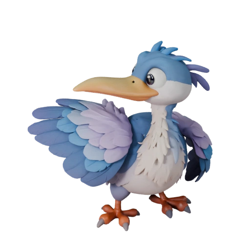 Мультяшный ассет цапли с акцентом на направление перьев, низкополигональный, pbr перья и подготовка к риггингу в реальном времени для Unity.