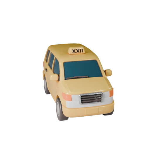 Мультяшная 3D модель автомобиля такси для разработки игр с низкополигональной геометрией и стилизованными окрашенными поверхностями с смелым цветовым блоком, упрощенными бликами и читаемыми формами транспортного средства.