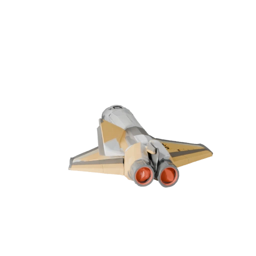Мультяшная 3D-модель космического шаттла для разработки игр с низкополигональной геометрией и стилизованными окрашенными поверхностями с смелым блочным цветом, упрощенными бликами и читаемыми формами транспортного средства.