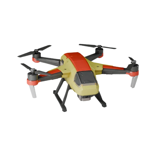 Мультяшный квадрокоптер дрон 3D модель для разработки игр с низкополигональной геометрией и стилизованными окрашенными поверхностями с яркой цветовой блокировкой, упрощенными бликами и читаемыми формами транспортного средства.