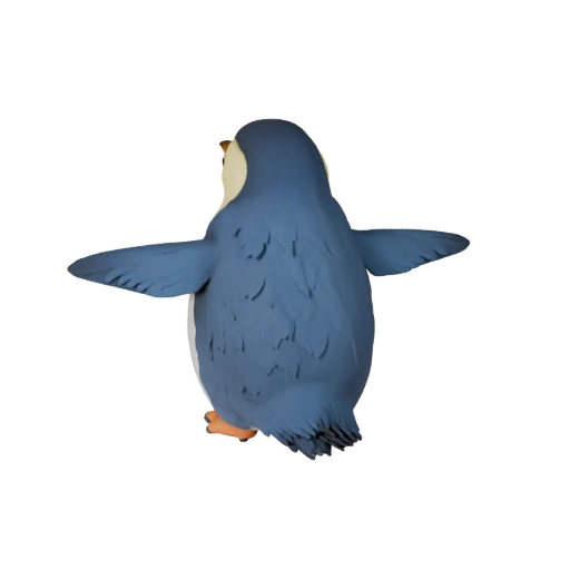 Мультяшный ассет пингвина с акцентом на детализацию хвоста, низкополигональный, pbr перья, и подготовка к риггингу в реальном времени для Unity.