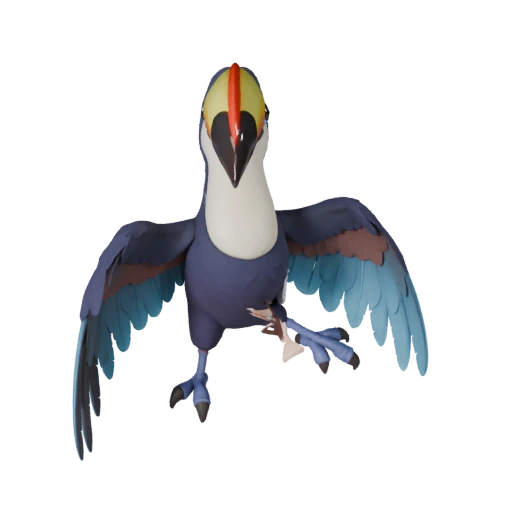 Мультяшный ассет тукана с акцентом на профиль клюва, низкополигональный, pbr перья и подготовка к риггингу в реальном времени для Unity.