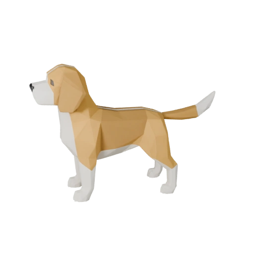 Низкополигональный ассет собаки бигль с акцентом на плоскости морды, низкополигональность, PBR мех и подготовку к риггингу в реальном времени для Unity.