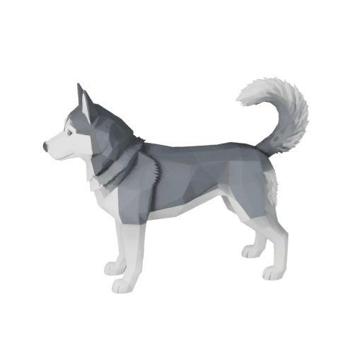 Низкополигональный ресурс сибирского хаски, ориентированный на плоскости морды, низкополигональность, PBR мех и подготовку к риггингу в реальном времени для Unity.