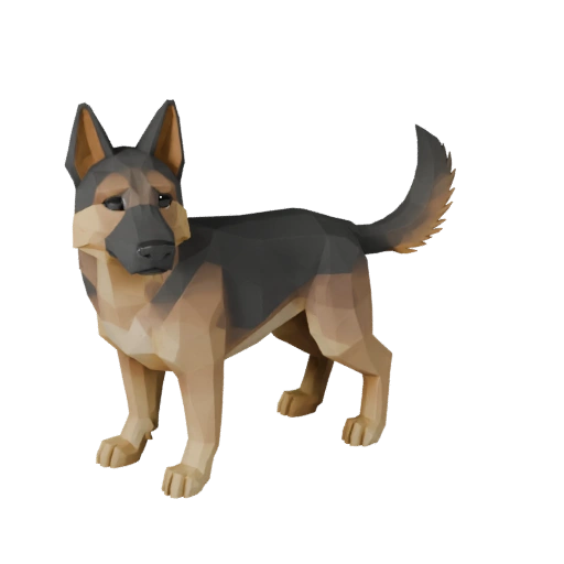 Низкополигональная немецкая овчарка, ориентированная на плоскости морды, низкополигональную модель, PBR мех и подготовку к риггингу в реальном времени для Unity.