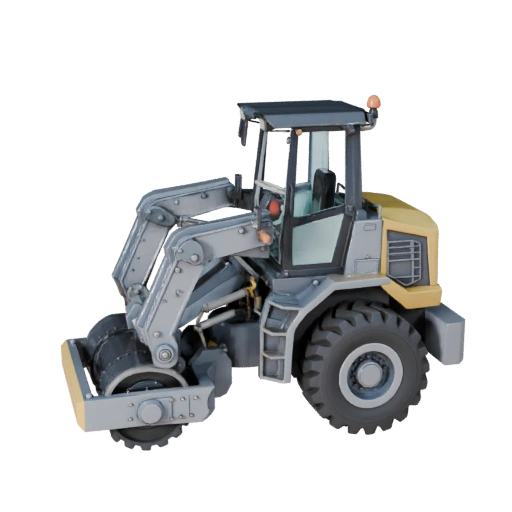 Низкополигональная 3D модель катка для разработки игр с низкополигональной геометрией и окрашенным металлом pbr, гидравлическими компонентами, резиной, стеклом и промышленным износом.