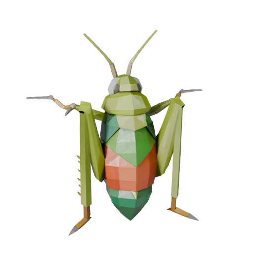 Низкополигональный ассет кузнечика с акцентом на сегментированные части тела, низкополигональность, стилизованный экзоскелет и подготовку к риггингу в реальном времени для Unity.