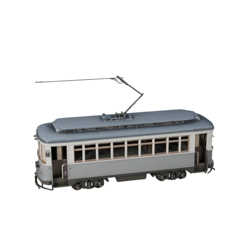 Готовая к использованию в Unity 3D модель винтажного трамвая для разработки игр с низкополигональной геометрией и PBR окрашенным металлическим корпусом, окнами, сталью ходовой части и зонами материалов, готовыми к интерьеру.